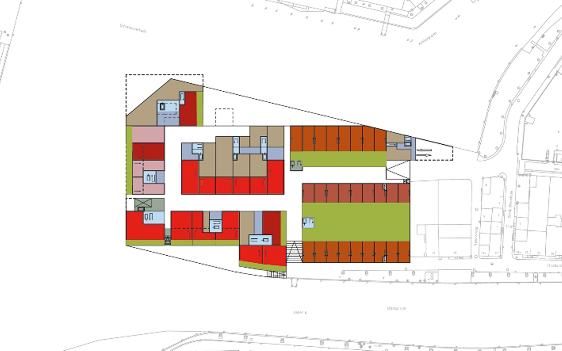 De nieuwe bebouwing wordt zodanig vormgegeven dat de oostwest gerichte route, die reeds aanwezig is, door wordt gezet in het plan. Op deze wijze ontstaat een logische informele opeenvolging van kleinschalige plein en straatruimtes. De openbare stedelijke ruimte dringt door tot in het hart van het bolwerk. De openbaarheid van het bolwerk is van buitenaf zichtbaar door de sneden die de bebouwing onderbreken. Omgekeerd is de stedelijke omgeving via deze sneden vanuit het centrale plein ervaarbaar.