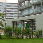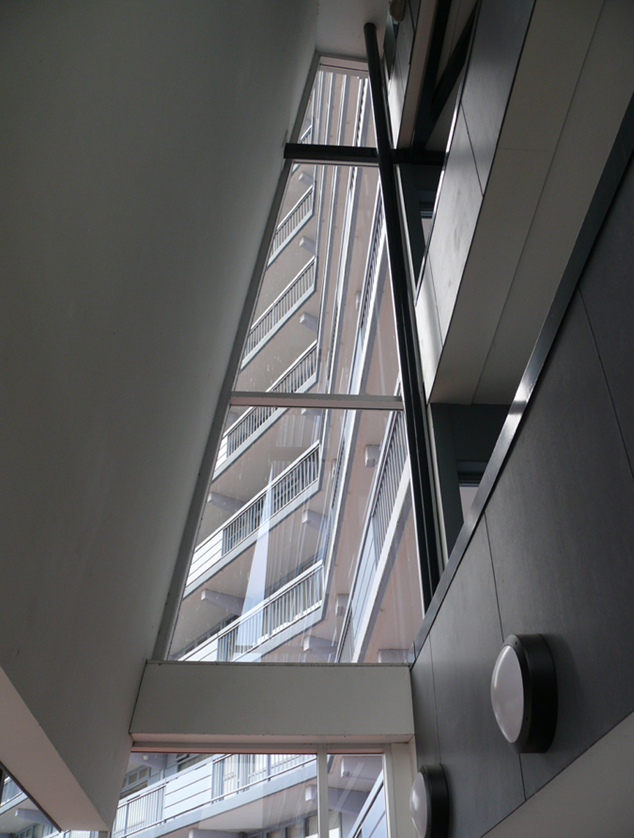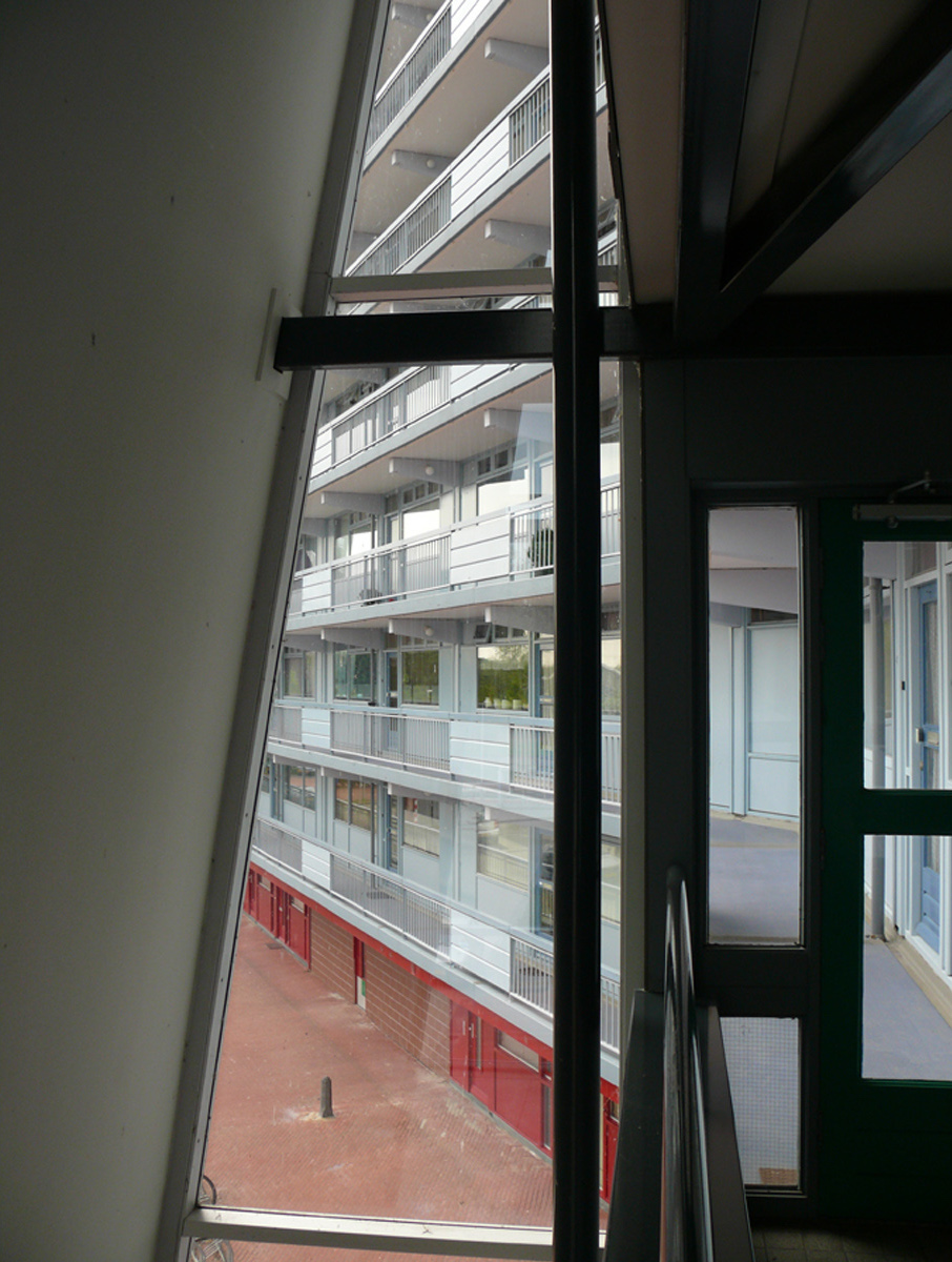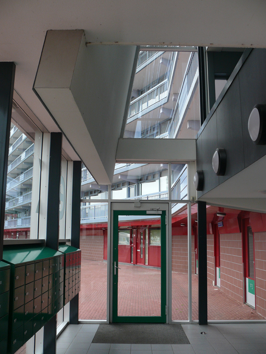 TUSSENSCHAAL In de bestaande flats beleef je de schaal van de woning en de schaal van het complex. De tussenschaal ontbreekt. Uitgangspunt is dat elke vernieuwing of toevoeging moet bijdragen aan de realisatie van een tussenschaal: De schaal van het eigen trappenhuis, van een beperkt aantal bergingen, van voorzieningen voor ouderen en voor kinderen, van een groepje parkeerboxen in het parklandschap opgenomen, van een groepje plintwoningen. Wat met ‘menselijke schaal’ wordt aangeduid is feitelijk een architectonische expressie van de groep, het collectief. Trots en verantwoordelijkheid voor de gedeelde omgeving is de basis voor een duurzaam leefmilieu.