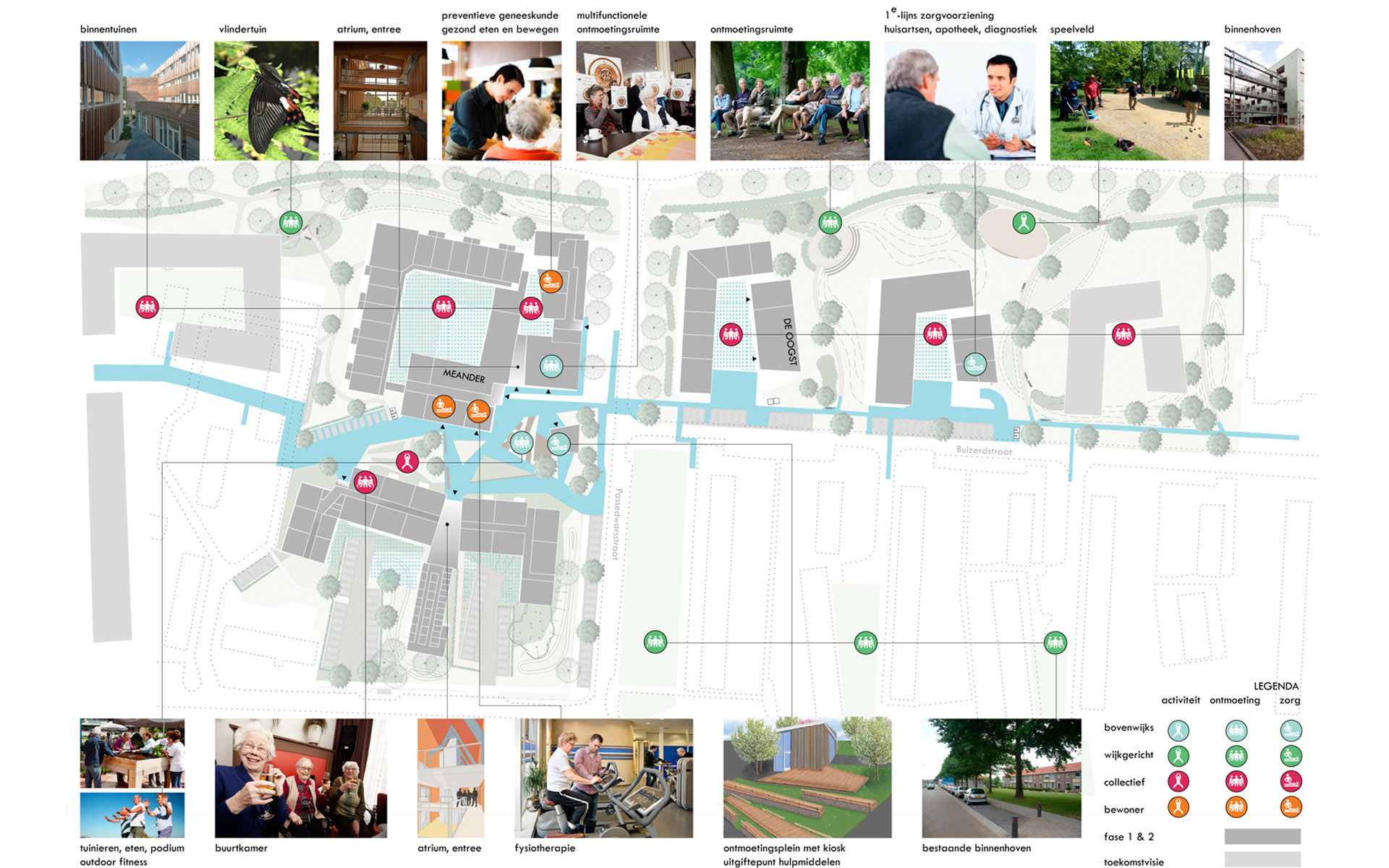 LEVENSWEG Ons bureau is in 2005 voor het eerst geselecteerd als stedenbouwkundige en architect voor een grootschalige zorgopgave. Omdat we inzetten op het verbinden van strategische belangen van zorgverlener en woningbouwer: zorg op maat versus duurzame woningbouw. En vanwege ons sociaal-ruimtelijke concept de levensweg. Wanneer de zorgbehoevende bewoner minder mobiel wordt en de openbaarheid buiten zijn bereik dreigt te raken, is het van belang dat