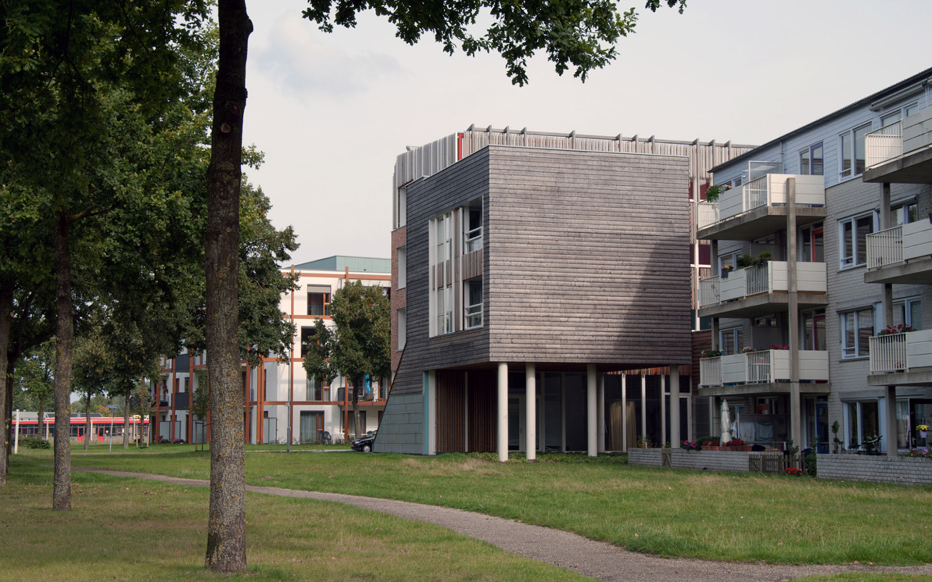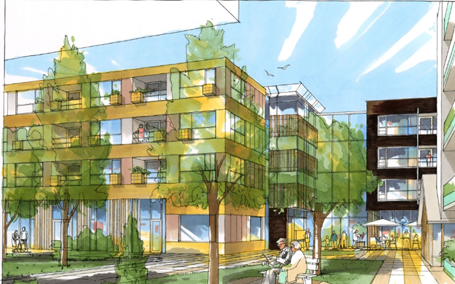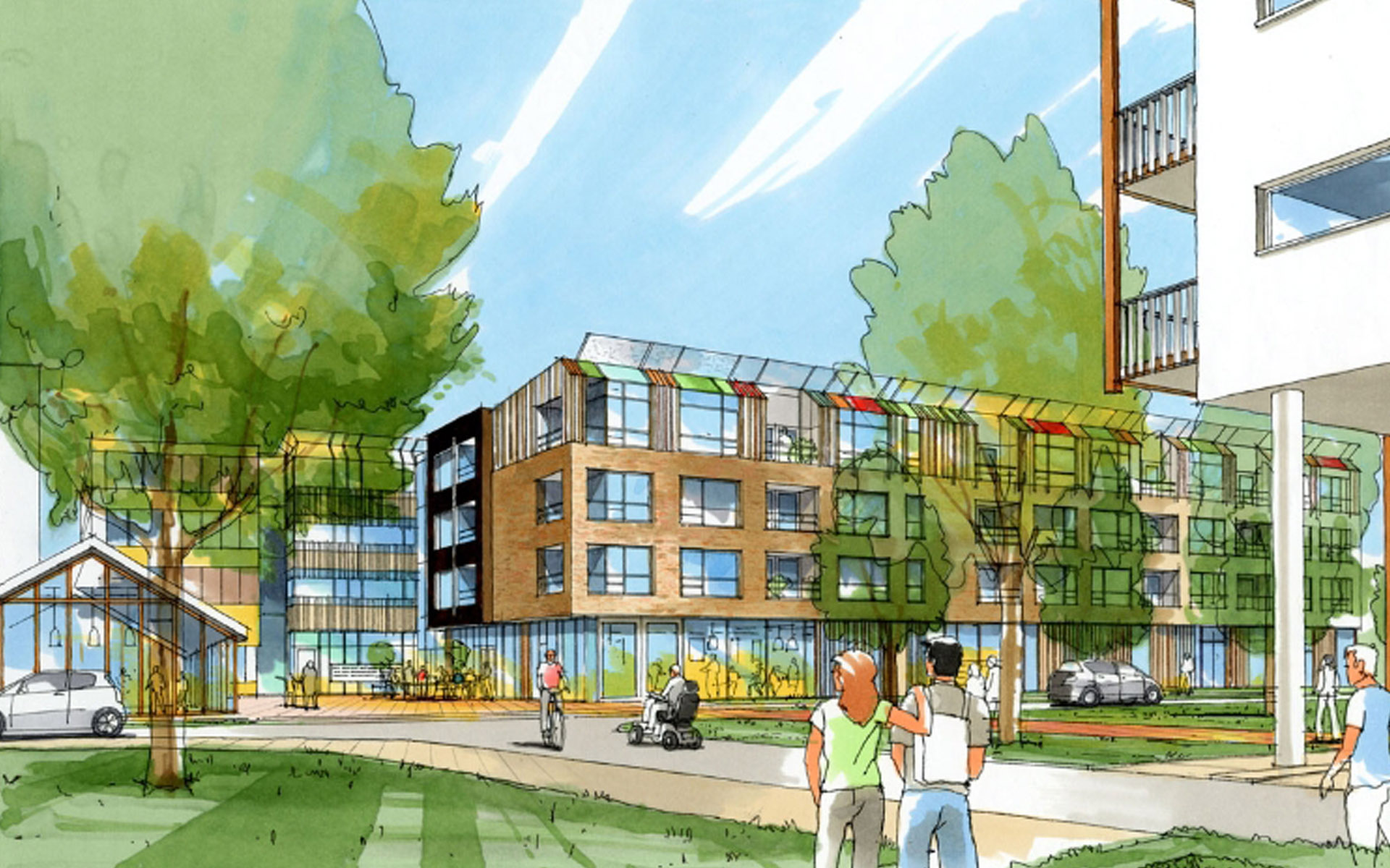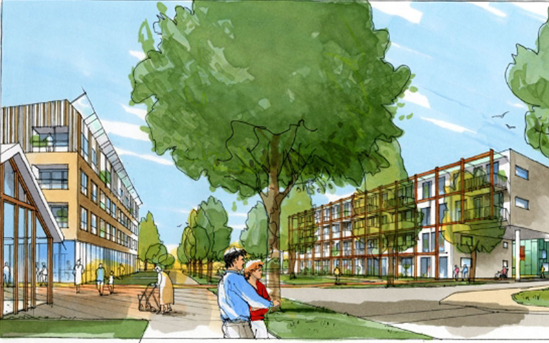 Geen grootschalige bejaardenhuizen ver weg achter plantsoenen en parkeerplaatsen, maar wonen aan vitale routes in de wijk. Met voorzieningen voor eenieder aan de route. Ontschotten, mixen, diversiteit en verblijfskwaliteit zijn leidende thema’s van de levensweg.